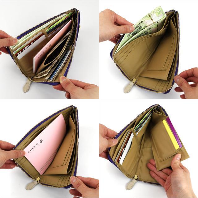 ファスナーを開くと、左右にサイドポケットが2つと12枚分のカードポケットが並びます。中央のオープンポケットは、小銭入れやレシートの保管スペースとしての使用が可能。ポケットを中仕切りとした、両側のスペースにはお札を入れることができます。外側のファスナーポケットは、コインや切符、チケットなどを保管しておくと出し入れがスムーズ。大容量ではありませんが、目的に応じて収納場所を自由に選べるところが、このお財布の魅力です。
