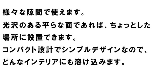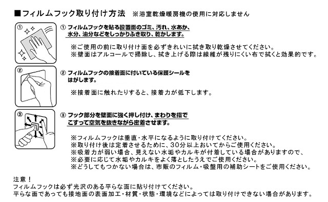 光沢のある平らな面にフィルムフックを貼り付けるだけで簡単に取り付けることができます。