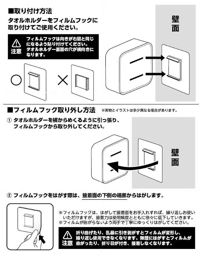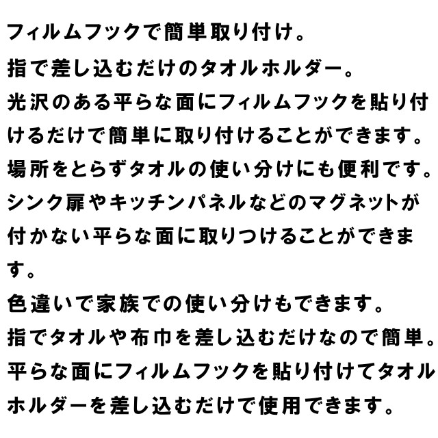 平らな面にフィルムフックを貼り付けてタオルホルダーを差し込むだけで使用できます。