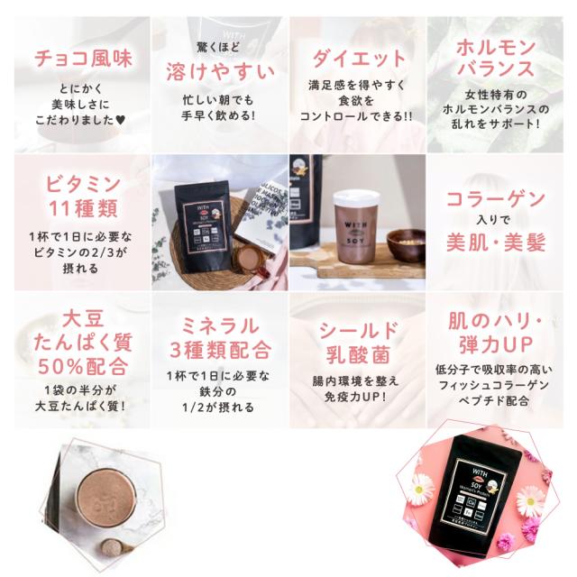 WITH SOY Woman's Protein は綺麗になりたい30代以上の女性に届けたい美容成分入りソイプロテインです。
