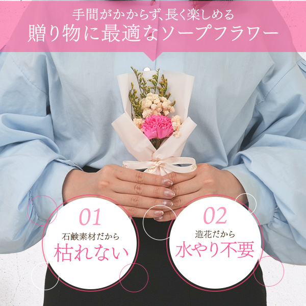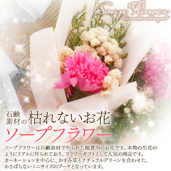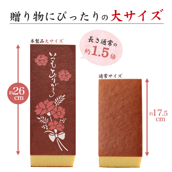 ソープフラワーとスイーツがセットになった、母の日のための特別ギフト。 ソープフラワーは石鹸素材で作られた観賞用のお花です。 カーネーションを中心に、かすみ草とナチュラルグリーンを合わせた ブーケタイプのソープフラワー。ミニタイプなのでかさばらず、ギフトに最適です。 長崎堂 母の日カステラは 独自配合の小麦粉、新鮮な卵、美味しさを極めた製法。 素材の持つ力で自然に焼き上げたカステラです。 母の日メッセージカードも付いています。 (※メッセージは定型文のみとなります) |