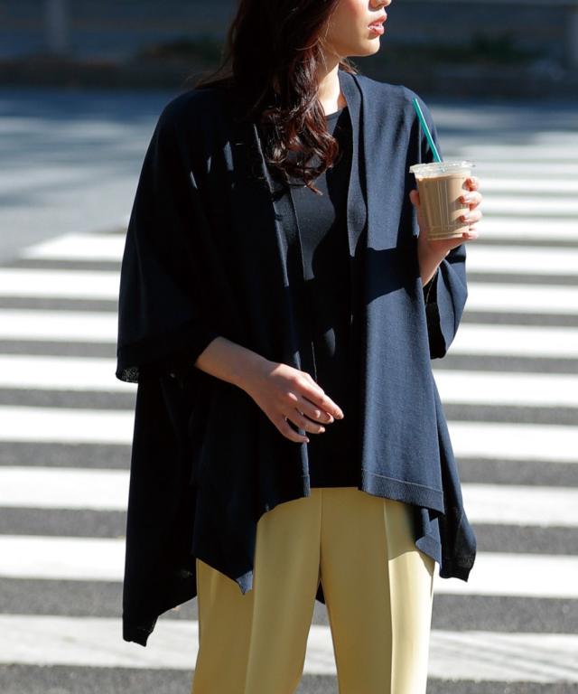 袖のボタンを外せばストールにもなる、ケープデザインのニットカーディガン。接触冷感機能付素材で肌にふれた瞬間、ひんやり!ゆったりシルエット&美しいドレープがエレガント。