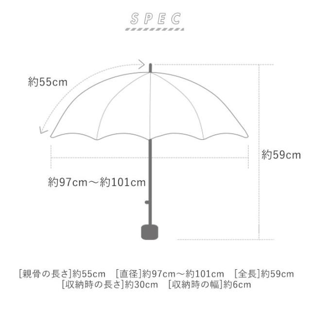| サイズ | [親骨の長さ]約55cm/[直径]約97cm〜約101cm/[全長]約59cm [収納時の長さ]約30cm/[収納時の幅]約6cm ※種類によって大きさが若干異なります。 ※サイズは当店計測の実寸サイズです。実際の商品ならびにメーカー表記サイズとは多少の誤差が生じる場合がございます。あらかじめご了承ください。 |