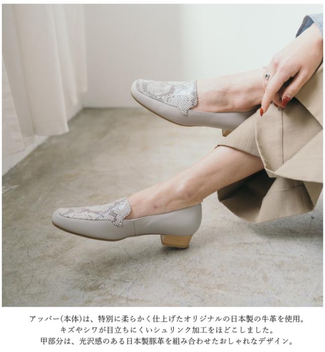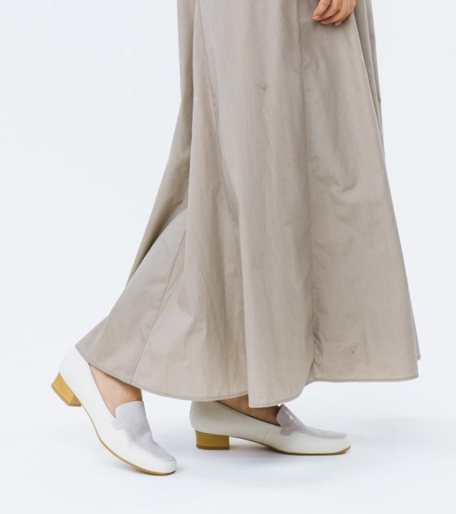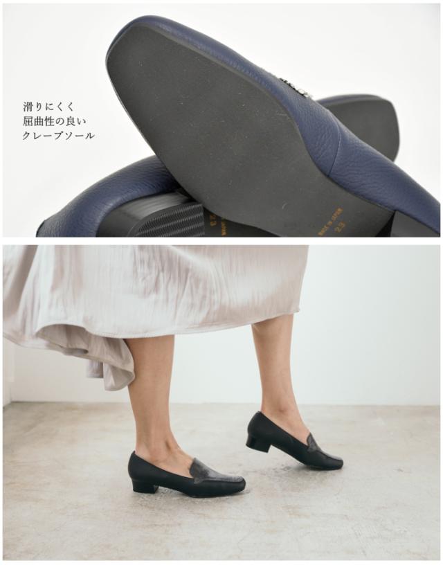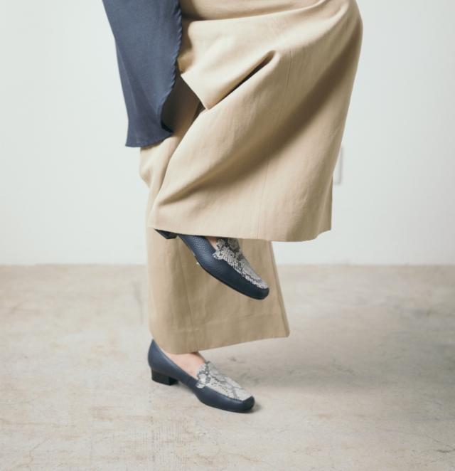 華奢見えするシルエットと、足をやさしく包み込む柔らかな履き心地を両立。異素材の組み合わせがおしゃれなモカパンプス。トレンド感がありスタイリッシュな印象のスクエアトゥ デザイン。