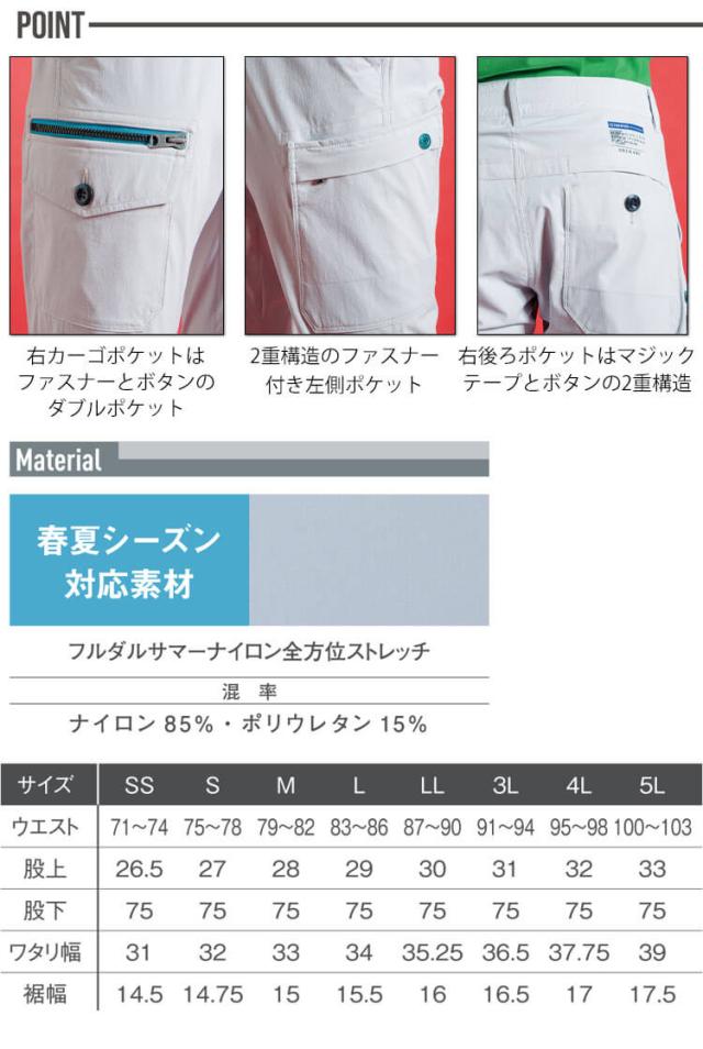 アイズフロンティア ナイロン全方位ストレッチカーゴパンツ 3672 春夏作業服 2WAY