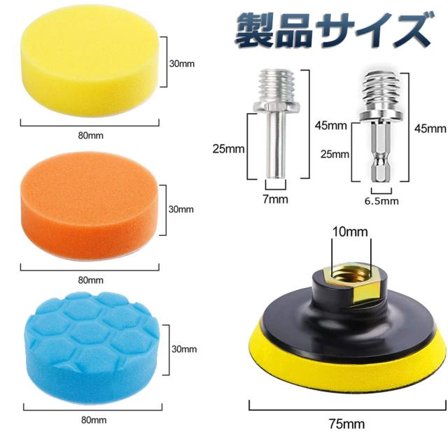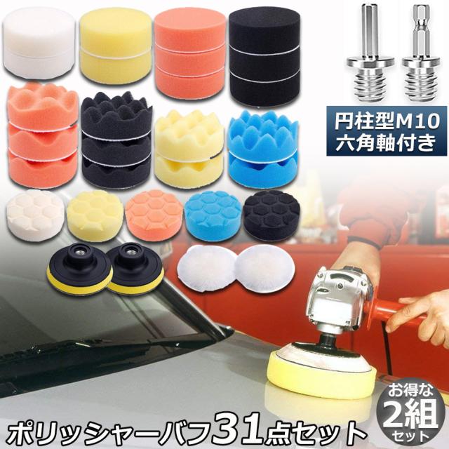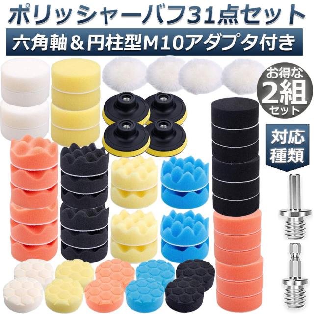 ポリッシャー バフ 2組セット 80mm 31点セット 六角軸付き すぐ使える 仕上げ 電気ドリル インパクトドライバー用 洗車 車磨き スポンジ 研磨艶出し 塗装仕上げ 水垢取りに