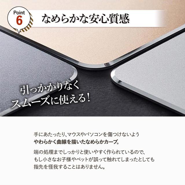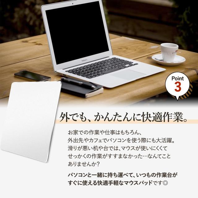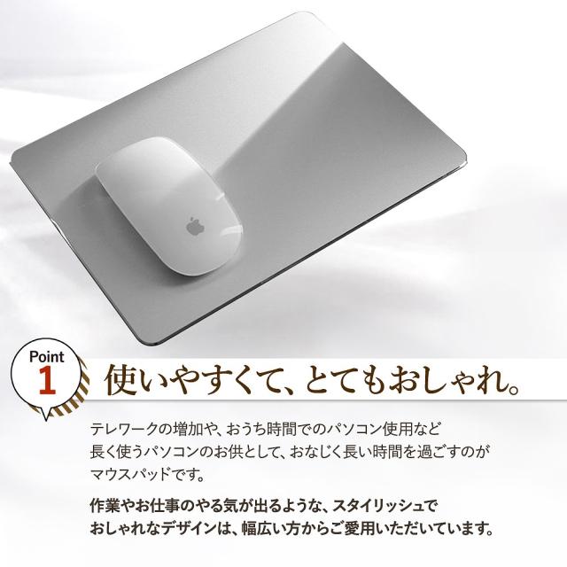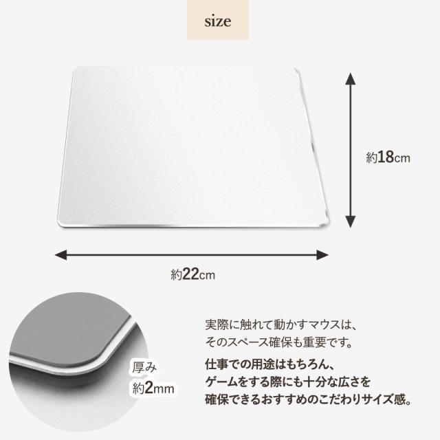 | 商品の説明 | お家での作業や仕事はもちろん、外出先やカフェでパソコンを使う際にも大活躍。 滑りが悪い机や台では、マウスが使いにくくてせっかくの作業がすすまなかった…なんてことありませんか? パソコンと一緒に持ち運べて、いつもの作業台がすぐに使える快適手軽なマウスパッドです◎ 高品質なアルミ合金を使用しているので、長時間のパソコン操作でマウスを使用しても疲れにくいのが特徴。 マウスパッド自体の劣化もしにくいので、長期間に渡って長くお使いいただけます。 布製、紙製のマウスパッドだと染みてしまう水滴も、金属製ならお手入れ楽ちん。 汚れてしまっても、流水で簡単にお掃除ができるのでいつでもきれいが保てて清潔にお使いいただけます。 手にあたったり、マウスやパソコンを傷つけないようやわらかく曲線を描いたなめらかカーブ。 実際に触れて動かすマウスは、そのスペース確保も重要です。 仕事での用途はもちろん、ゲームをする際にも十分な広さを 確保できるおすすめのこだわりサイズ感。 |
