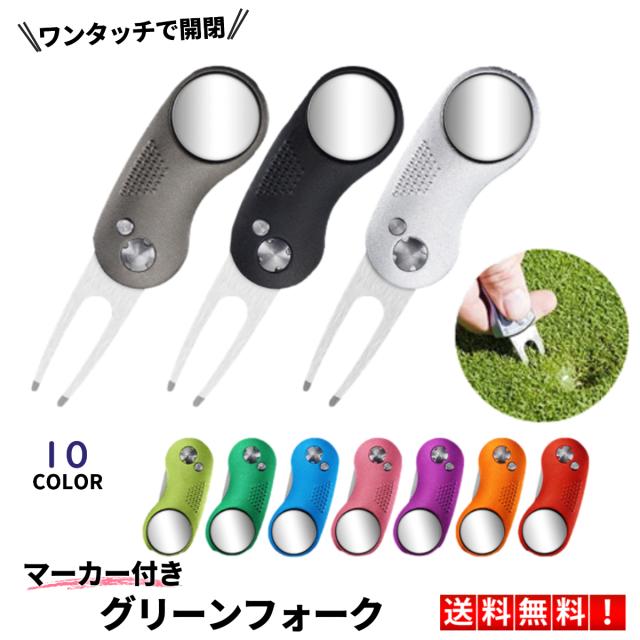 グリーンフォーク マーカー付き ゴルフ 丸型 収納タイプ かっこいい 2本刃 リペアツール ピッチマーク 収納 折り畳み式 使いやすい ディボットツール マーカー
