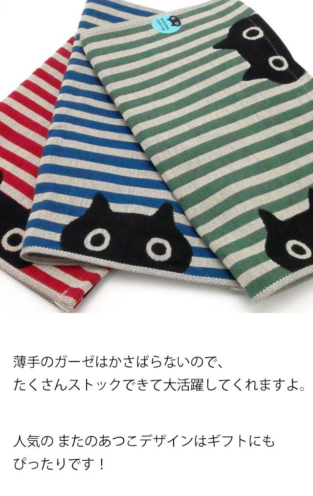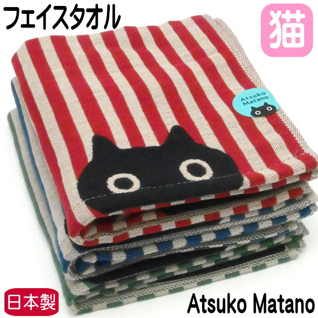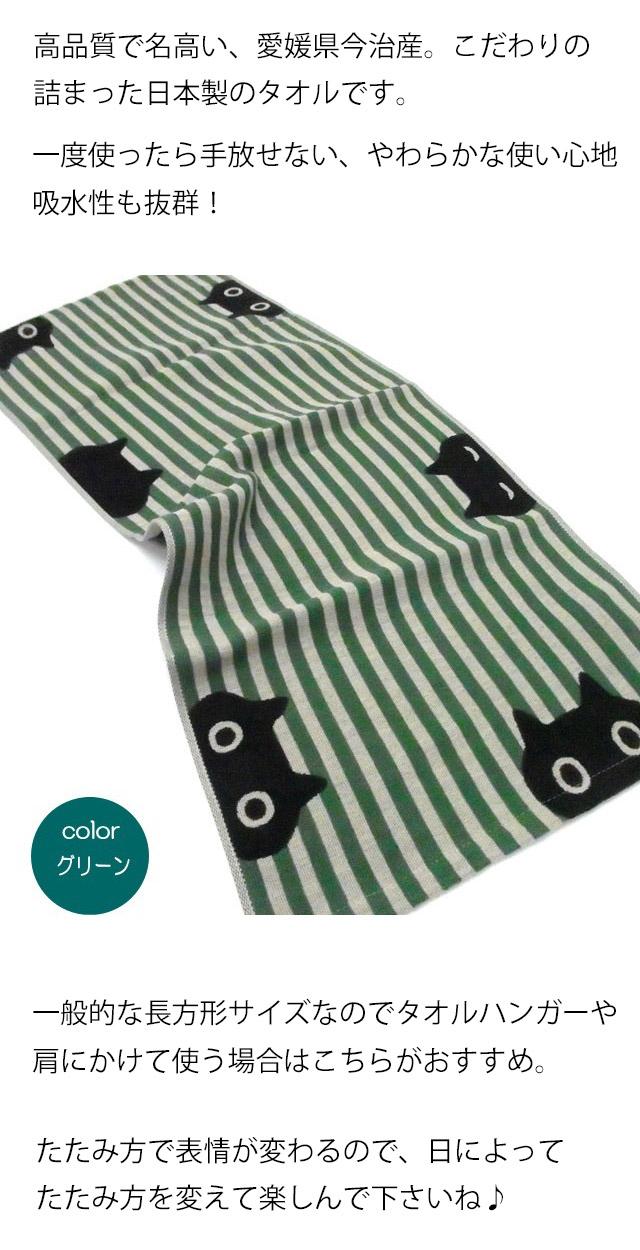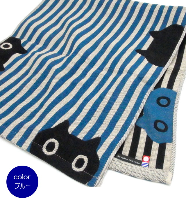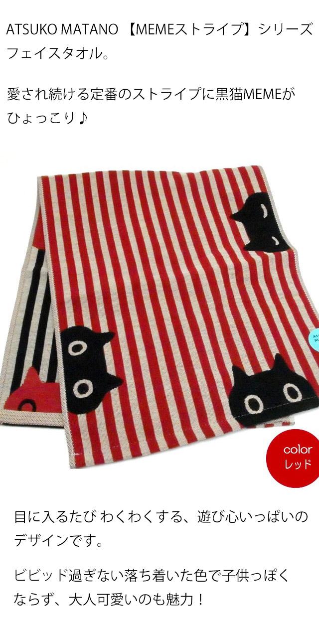 フェイスタオル 猫柄 MEMEストライプ またのあつこ ガーゼ 黒猫 34×75cm 綿100% 今治 日本製 猫雑貨 猫グッズ かわいい おしゃれ