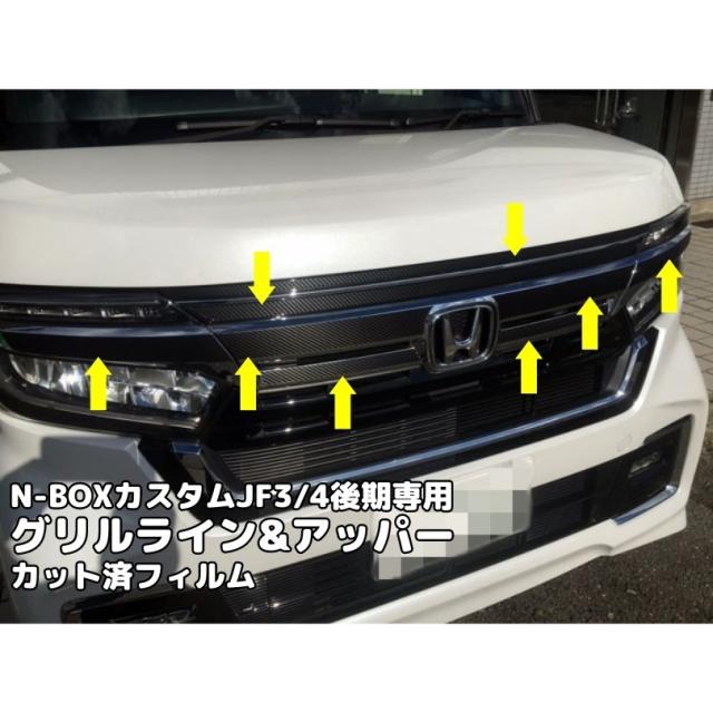 N-BOXカスタムJF3/4後期専用 グリルライン+アッパーカット済み 選べるカーボンシート フロントエンブレム部分左右下+ヘッドライト+グリル上部 アクセサリー