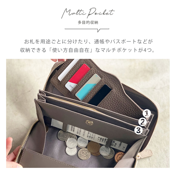 通帳やパスポート、お札などを収納できるマルチポケットを4つ完備。
