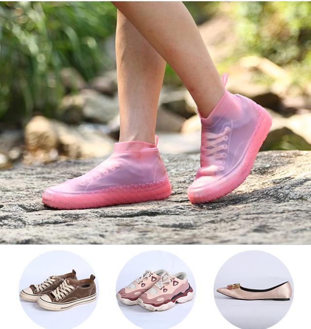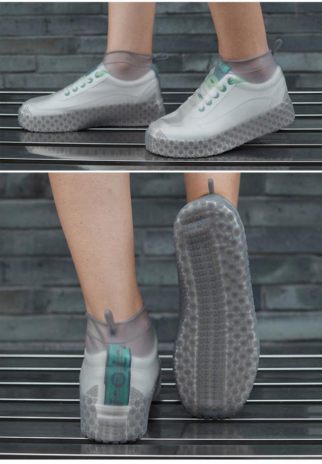 【ファッションと防水】防水PVC。半透明の色は、靴の外観を表示します。これは合わせやすいです。シューズカバー内部に防水シートがあるのため、雨の浸入を完全にシャットアウトできます。雨や汚れから大切な靴を守ってくれるレインシューズカバーです。【滑り止め靴底】靴底は丈夫なゴム製で凹凸の柄付いて、濡れた道にも滑りにくくなっています。出かけるもっとも安心します。雪の積もった道、濡れた歩道、キャンプ場の川辺、登山道等の場合に大活躍!【着脱簡単】靴を履いたまま直接にシューズカバーの上から履きます。