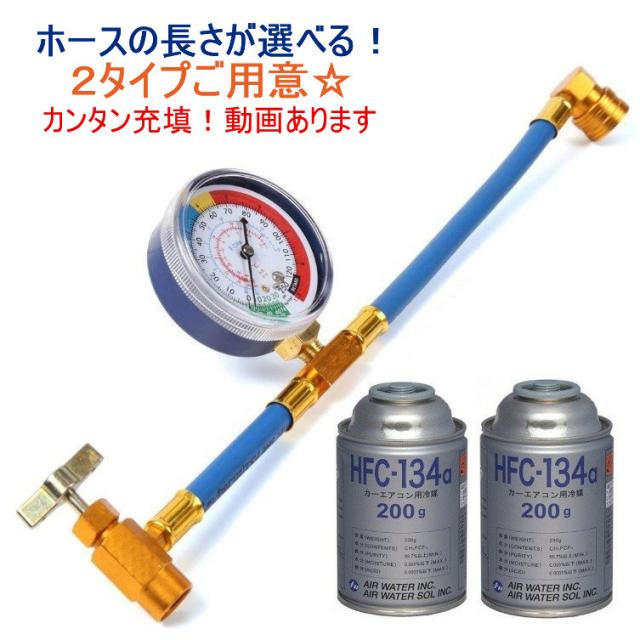 【冷気復活・燃費向上】日本語説明書付き エアコン クーラー ガス チャージ ホース メーター付 自動車用 R134aクーラー専用 カーエアコン用冷媒 HFC-134a(缶2本)セット