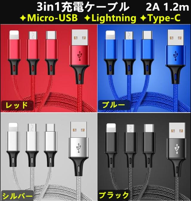 充電ケーブル ライトニングケーブル USB Type C Micro USB 3in1 2A急速充電対応 iPhone Android 1.2m