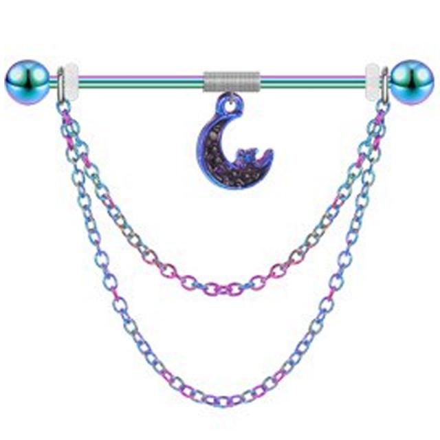 星と三日月のチャームが揺れる14ゲージの長いストレートバーベルに2連の鎖チェーンをつなげた虹色レインボーのインダストリアル用ボディピアス。