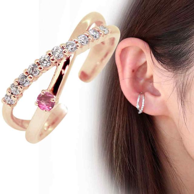 10月誕生石ピンクトルマリンを使用した10金製の、クロスラインのイヤーカフです。
