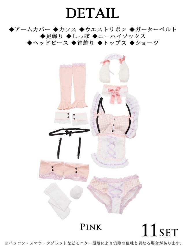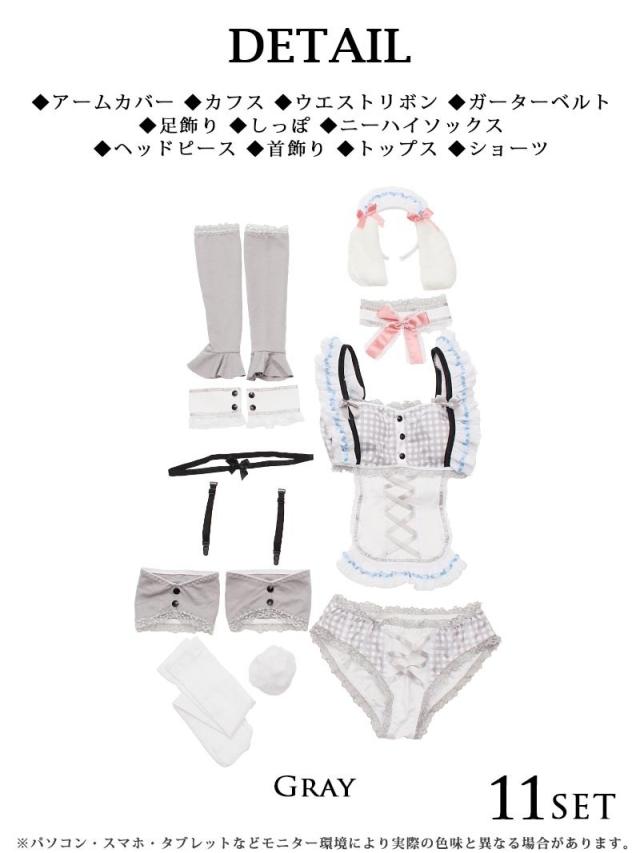 セット内容:ヘッドピース・首飾り・アームカバー・カフス・トップス・ショーツ・しっぽ・ニーハイソックス・ガーターベルト・ウエストリボン・足飾り