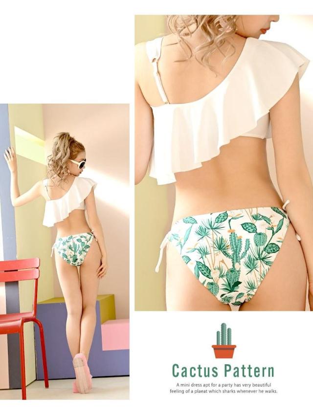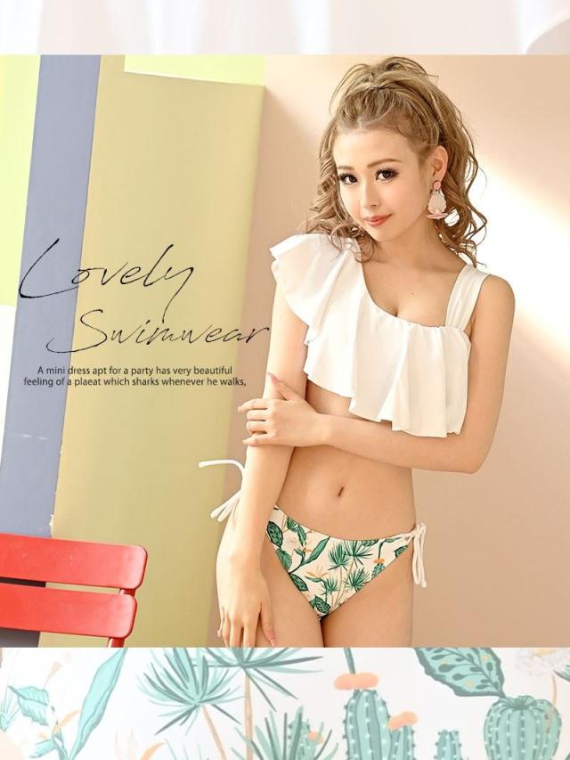 ☆フリルデザインが女の子らしい可愛さを演出するアシメトリーなワンショルダービキニはボトムの紐リボンデザインが大人っぽさも感じさせるレディース水着♪