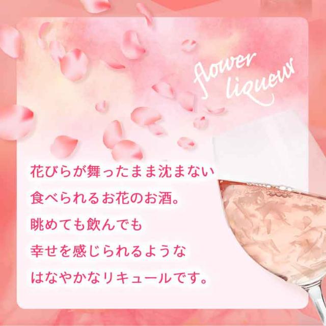 花びらが舞ったまま沈まない食べられるお花のお酒。眺めても飲んでも幸せを感じられるようなはなやかなリキュールです。 花本来の美しさをそのままに、独自製法で花びらが華麗に舞ったまま瓶に閉じ込めました。