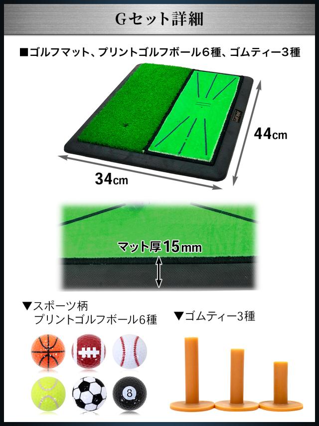 2WAYターフ&フェアウェイ芝ゴルフマット、スポーツ柄プリントゴルフボール6種、ゴムティー3点セット