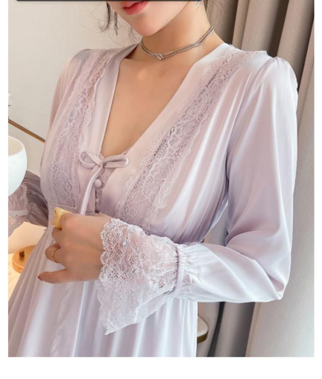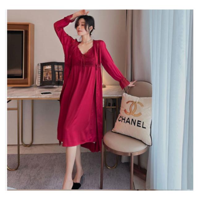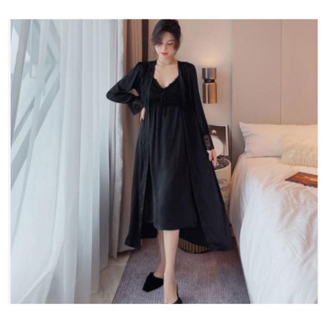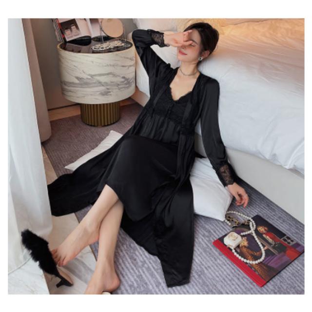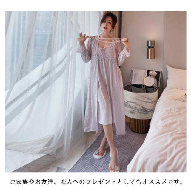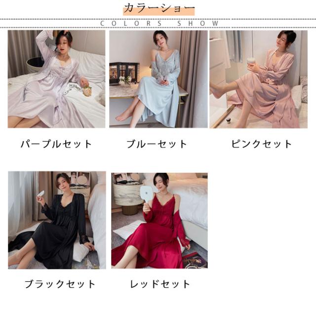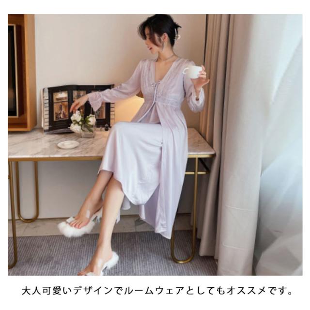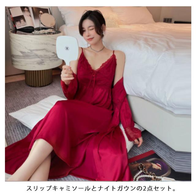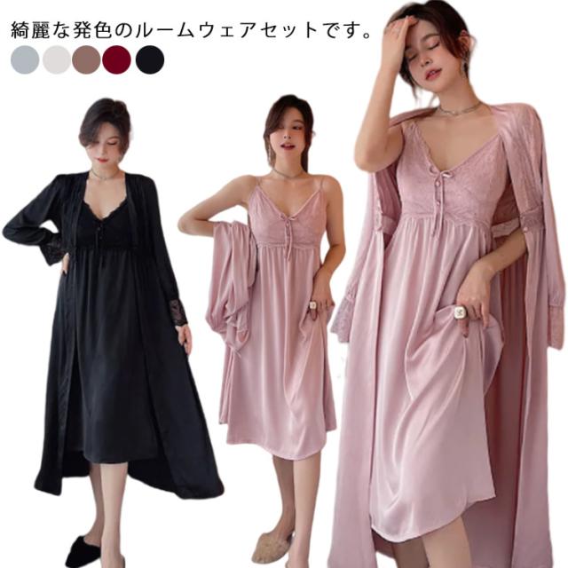 2点セット カップ付き ネグリジェ ワンピース ルームウェア パジャマ 寝間着 ナイトウェア ロングガウン かわいい キャミソール レース アイスシルク 姫系 春 夏 秋 送料無料
