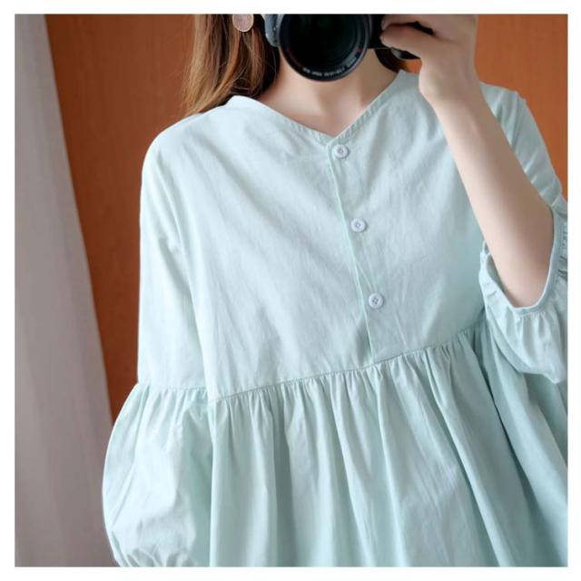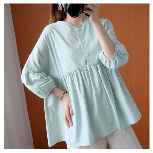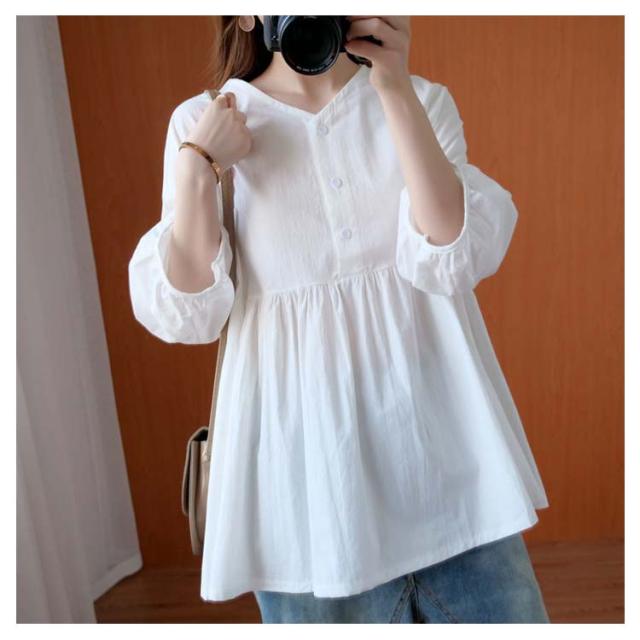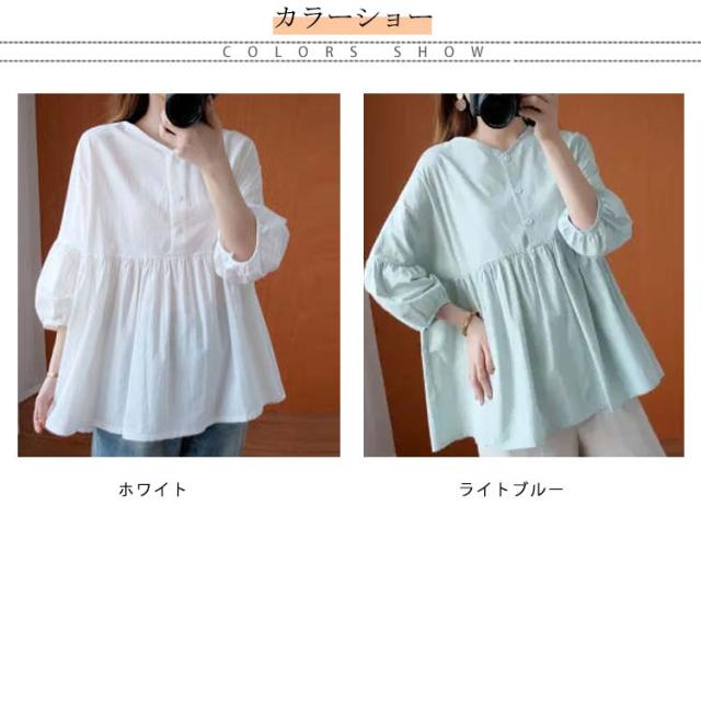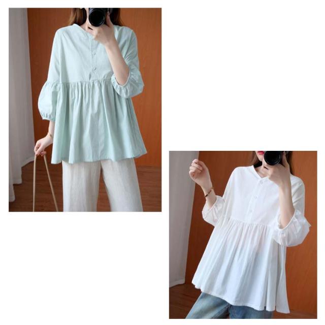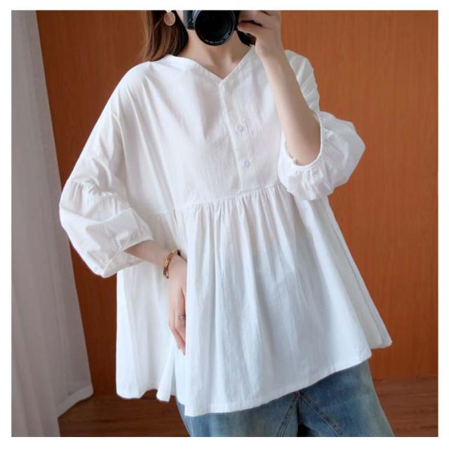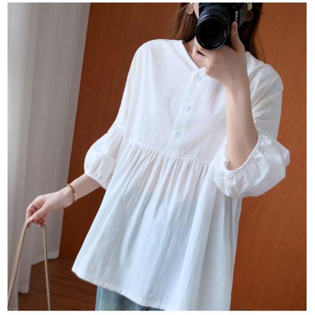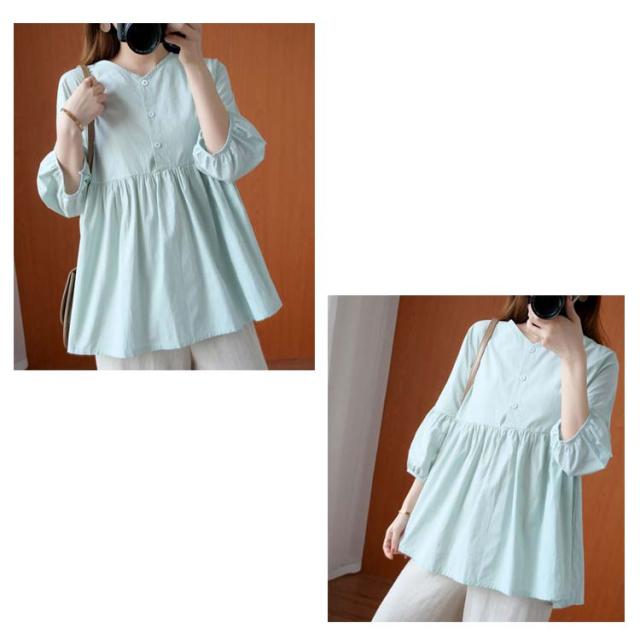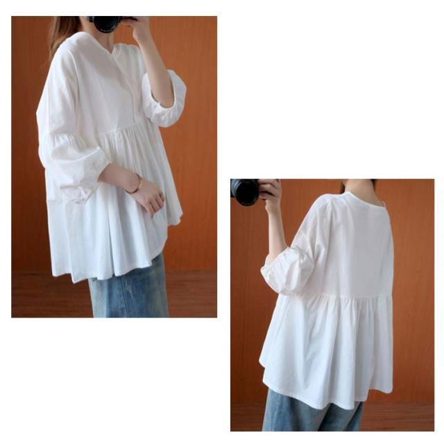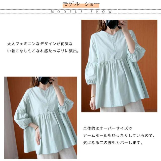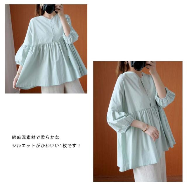 7分袖 シャツ ブラウス 送料無料 レディース トップス 春 夏 ヘンリーネック シャツブラウス タック Vネック 綿麻 ゆったり ビッグシルエット 体型カバー 大人可愛い フレア シンプル