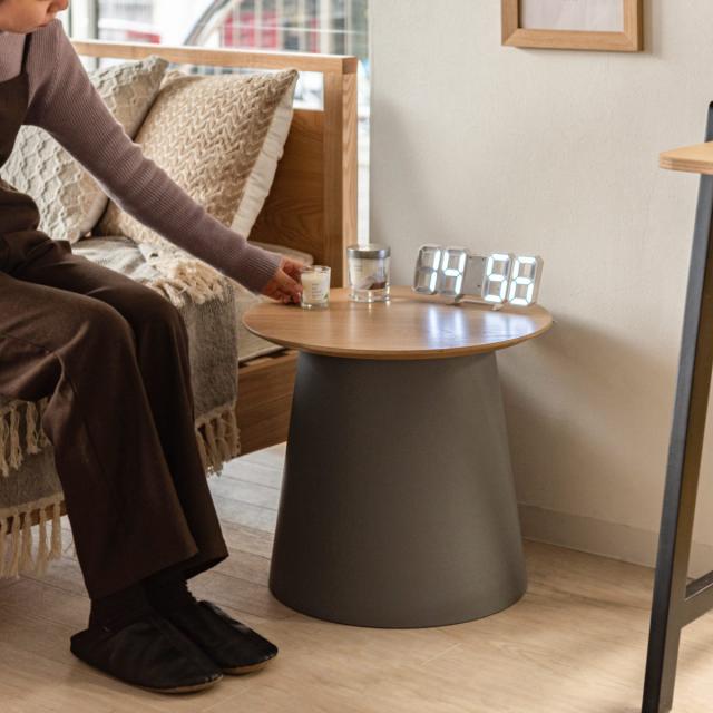 天然木で温かみのある天板と、異素材の脚部の組み合わせが特徴的なサイドテーブルです。天板も脚部も円形でシンプルな飽きのこないデザインは、お部屋をもっと快適で居心地の良い空間にしてくれます。