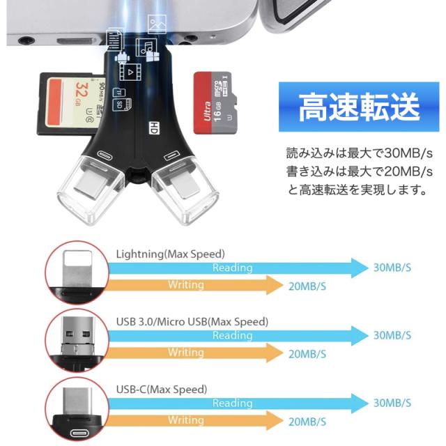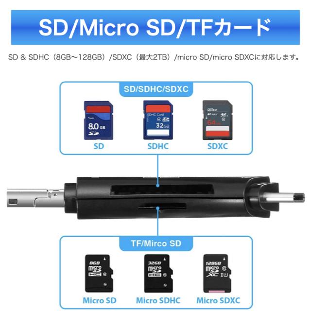●ブラウザで表示する日本語取扱説明書付き●USB 2.0 & Micro OTG & USB-Cに対応。●OTG機能付、快速なデータ伝送が実現できます。●Android端末はOTGに対応するか事前にご確認ください。●PC・スマホ・タブレットの様々なデータをSDカードを通してデータ転送を行います。●デジカメやビデオカメラ、アクションカメラ等で撮った写真や動画をスマホやタブレットで視聴できます。●WiFiやBluetooth接続の必要はありません。SDカードを挿入し端末に接続するだけ!重量 ●30g保証期間●商品到着日から6ヶ月間注意●他アダプタやハブとの併用による不具合は保証対象外となります。
