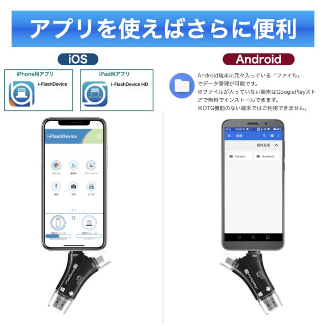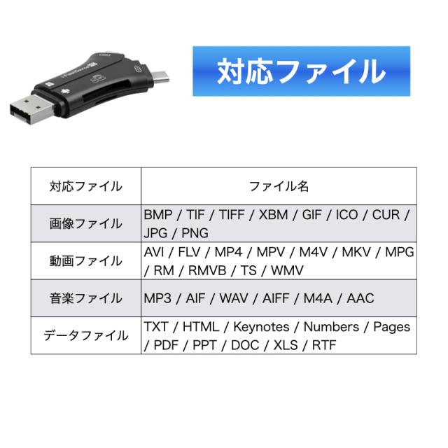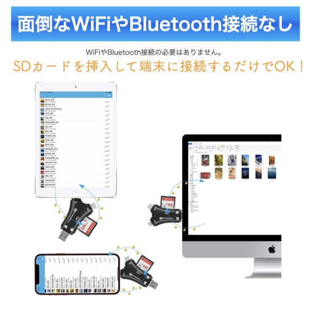 | 5in1 SDカードリーダー | ●ブラウザで表示する日本語取扱説明書付き ●USB 2.0 & Micro OTG & USB-Cに対応。 ●OTG機能付、快速なデータ伝送が実現できます。 ●Android端末はOTGに対応するか事前にご確認ください。 ●PC・スマホ・タブレットの様々なデータをSDカードを通してデータ転送を行います。 ●デジカメやビデオカメラ、アクションカメラ等で撮った写真や動画をスマホやタブレットで視聴できます。 ●WiFiやBluetooth接続の必要はありません。SDカードを挿入し端末に接続するだけ! |