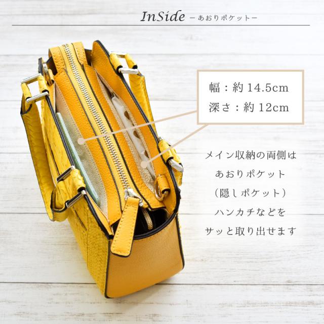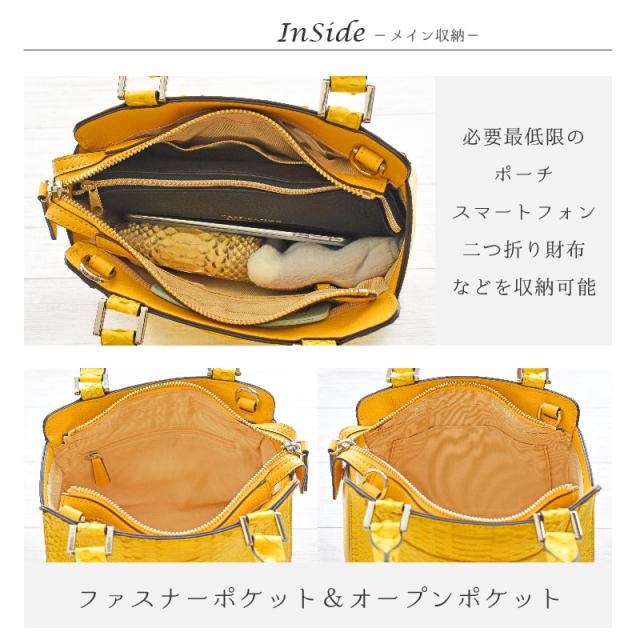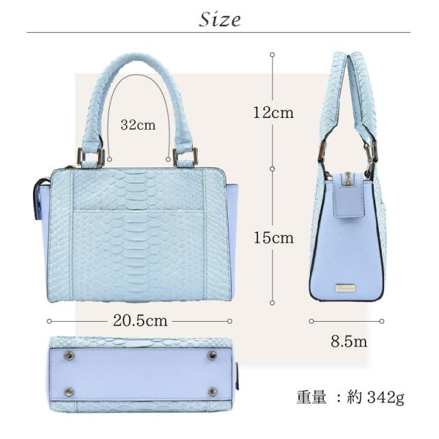 | 特徴 | 【素材】 ・持ち手はメイン素材であるパイソン本革で仕立て 統一感のあるデザインにしっとりと柔らかい手触りでずーっと持っていたくなります ・内側・側面・底面には耐久度の高い牛本革を採用異素材MIXでオシャレ度UP 【ハンドバッグ】 持つ人を上品に魅せる絶妙なスモールサイズ 落ち着きのあるパステルカラーは日々のお出かけを明るく華やかにします 【収納】 ・ミニバッグはたくさんの荷物を入れる事には適しませんが、 『使いやすい』にこだわりポケットを充実させました ・メイン収納の両側はあおりポケット(隠しポケット)ハンカチなどをサッと取り出せます。 必要最低限のポーチスマートフォン二つ折り財布などを収納可能 ・背面ポケットは幅が約14cm深さが約9cmのポケット付きパスケースなどの小物の収納に便利です ・高級感のあるシルバーの角カンが良いアクセントにハンドルが自在に動く取りまわしの良さもポイントです 底鋲付きで安定して自立汚れや擦れからバッグを守ります |