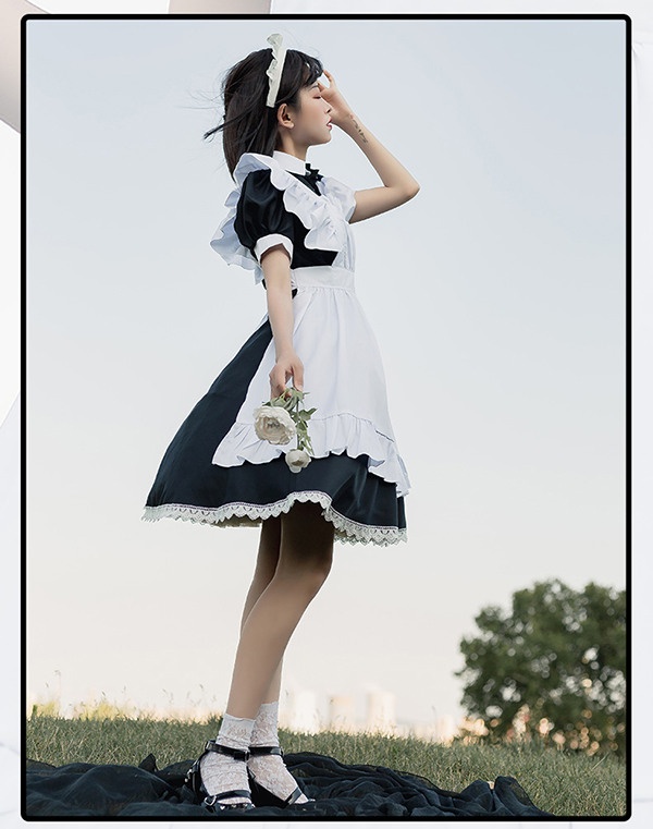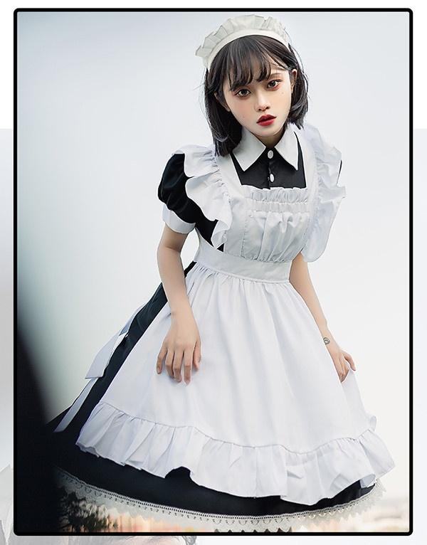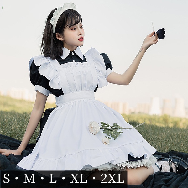 メイド服 コスプレ レディース メイド ハロウィン コスプレ衣装 アンティーク クラシック ウェイトレス フリル レース ひざ上 ミニ丈 パフスリーブ コスチューム 仮装 かわいい 大人用 イベント 忘年会 新年会 エプロン 正統派 da936s1s1c9