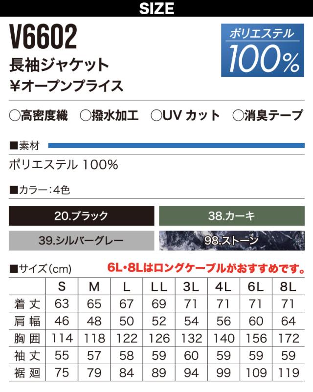 快適ウェア 空調作業服長袖ジャケット空調ウェア V6602 単品 S〜4L 6L 8L 10L 大きいサイズあり UVカット ポリエステル100% 村上被服 HOOH 電動ファン用ウェア 作業服
