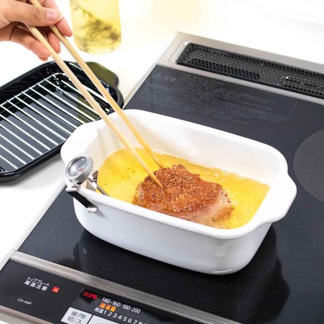 防水型の温度計・バット・すのこ網がセットになっているので、手軽に揚げ物料理にチャレンジできます。バットは下準備にも使え、調理中は網を組み合わせて油切りの受け皿として使用できます。調理中の温度管理に便利な温度計は、220度まで測定可能です。