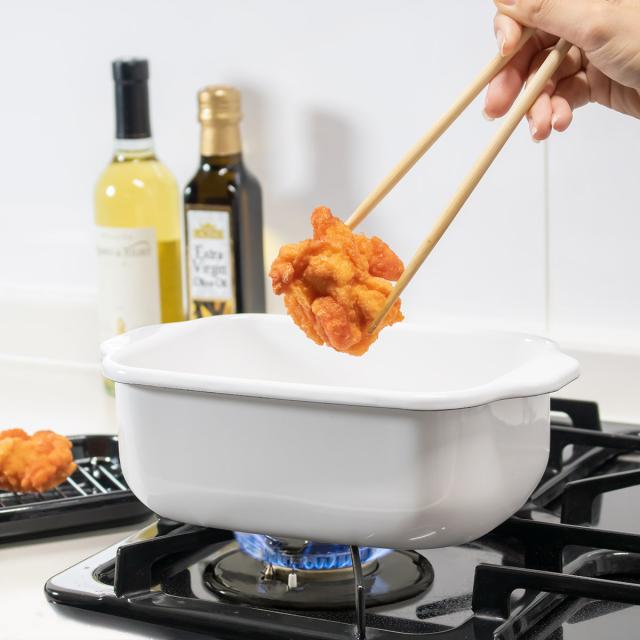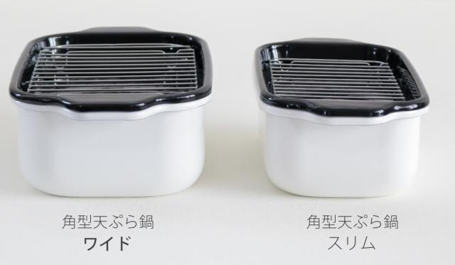 ホーロー素材の特性を活かした角型天ぷら鍋にワイドサイズが登場しました。スリムは1〜2人分やお弁当のちょっとした揚げ物に適しており、ワイドは3〜4人分の揚げ物に適しています。それでも丸形の天ぷら鍋に比べてコンパクトで扱いやすいです。