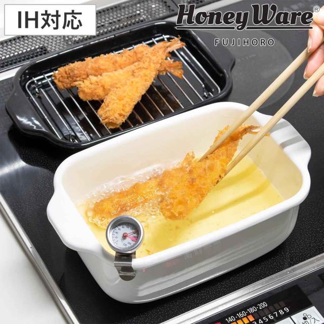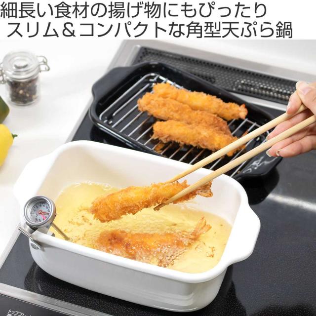 天ぷら鍋 角型 IH対応 富士ホーロー 温度計 揚げ網 バット付き ( ガス火 IH 対応 角型天ぷら鍋 揚げ鍋 琺瑯 ほうろう 揚げ物鍋 天婦羅鍋 少ない油 スリム コンパクト スクエア 富士琺瑯 白 ホワイト )