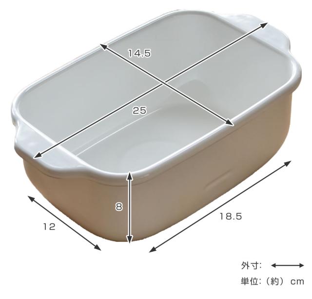 | サイズ | 【本体】 約 幅25×奥行14.5×8(cm) 底面:約 幅18.5×奥行12(cm) 重量:677g 【バット】 約 幅25×奥行14.5×高さ2.8(cm) 重量:314g 【スノコ網】 約 幅18.2×奥行11.2×高さ1(cm) 重量:62g 【収納時】 約 幅25×奥行14.5×高さ9(cm) 重量:1.05kg |
