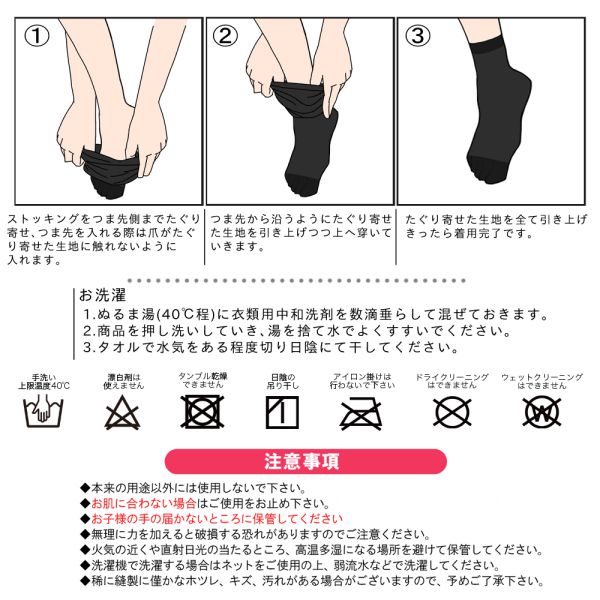 ・着用する際は商品つま先までたぐり、足のつま先を入れて沿うように生地を上げて穿いてください。