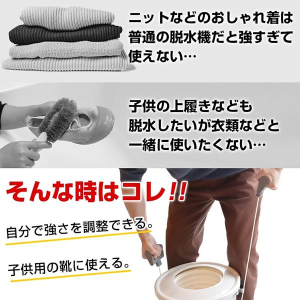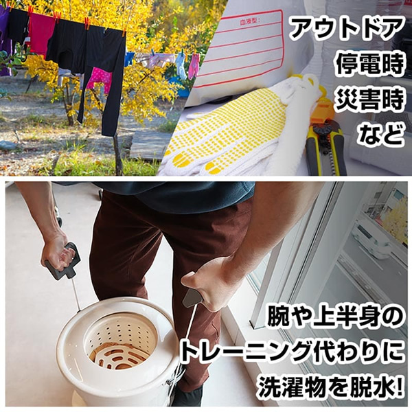 電気がいらない手動脱水機! 人力だからどこでも使えて、強弱も自分で調整できます。 ■サイズ:幅390×高さ380×奥行330(mm) ■重量:3800g ■付属品:本体、おさえフタ、排水ホース、日本語説明書 ■脱水槽:直径200×高さ180(mm) ■最大脱水容量:5.9L ■排水ホース:長さ:850mm 内径:30mm ■注意事項: ※操作ハンドルを強く引っ張りすぎると破損する場合があります。 ※不安定な場所で使用しないでください。 ※操作中や片付け時水がこぼれる可能性があります。濡れてもいい場所で作業を行ってください。 ※記載は商品仕様の一部です。仕様説明不足等の理由での返品はできません。特に適合等は必ずご確認ください。