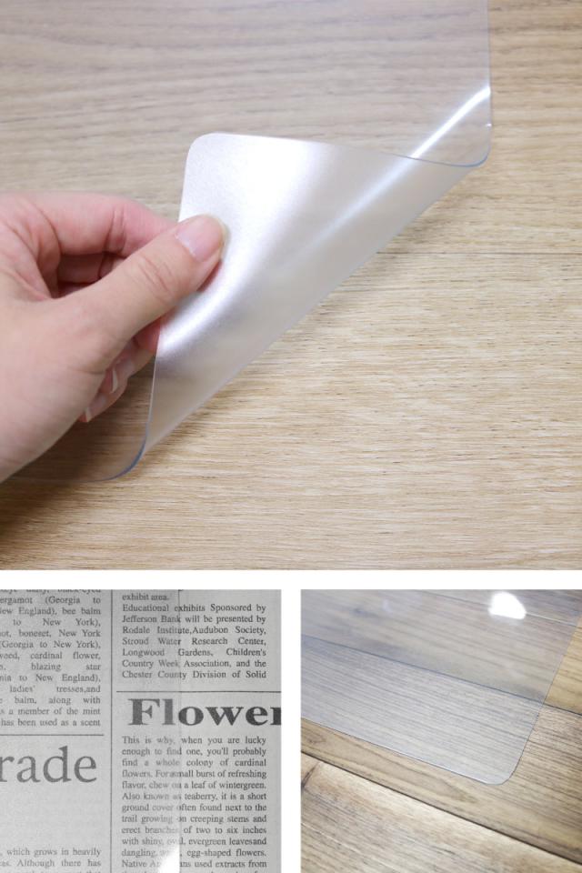 裏面には非転写加工が施されているので、テーブルとマットの間に挟んだ印刷物などのインクが付着するのを防ぎます。半透明タイプなので、テーブルの木目やテーブルクロスのデザインを損なわず、インテリアのテイストを問わず取り入れやすいのもポイントです。