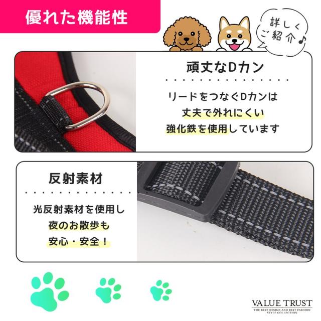 ■ワンちゃんの胸元にやさしい作りで長時間の装着でも快適に過ごせます。ベルト部分には反射ステッチを使用しており、夜のお散歩でも安心です。