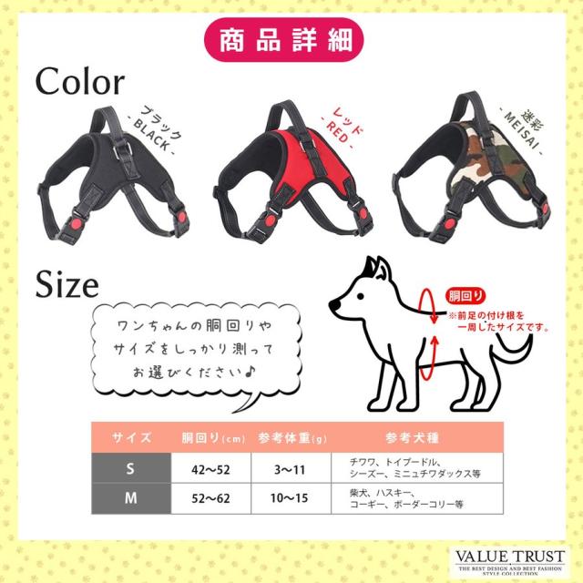 S/42〜52/37〜45/小型犬 M/52〜62/48〜58/中型犬 ※単位:cm ※リードは商品に含まれません。