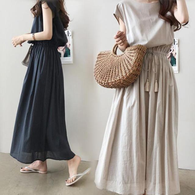 ワンピース 麻混 リネン混 春夏 涼しい ギンガムチェック 無地 ロング Aライン ワンピ レディース