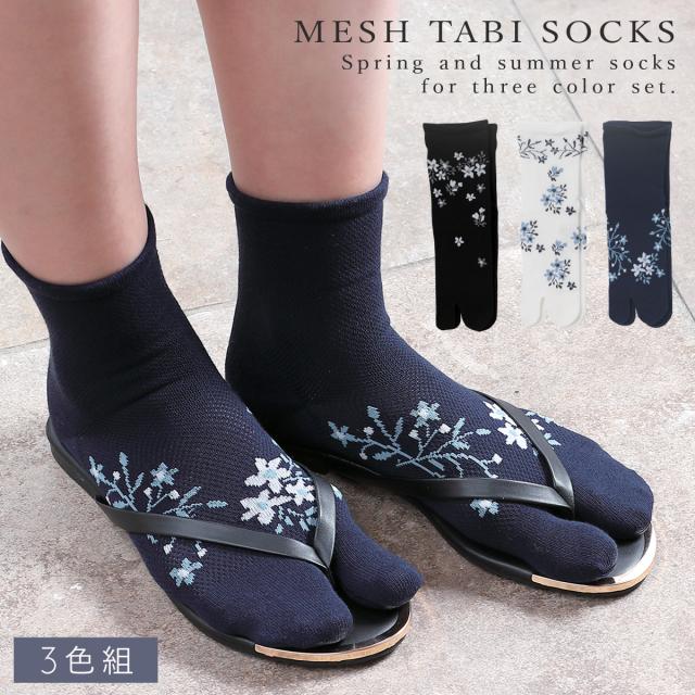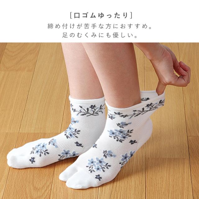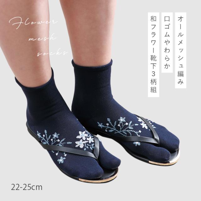 足袋ソックス レディース 和柄 浴衣 靴下 夏用 【3柄組】22-25cm 花柄 夏 薄手 メッシュ 蒸れない 涼しい 【 快適な履き心地・夏靴下 】 まとめ買い 3足 おしゃれ 履き口 ゆったり ズレない かかと 補強 丈夫 さわやかメッシュゴムなしタビソックス
