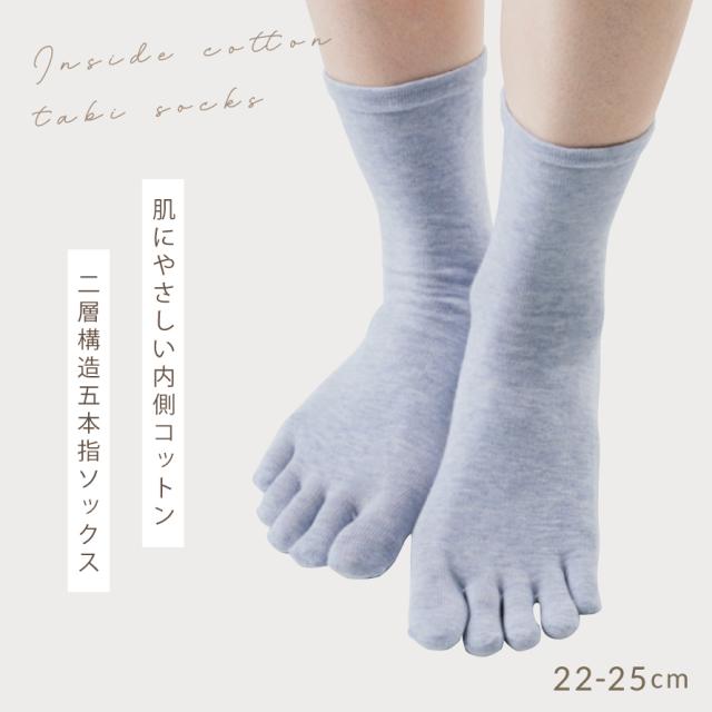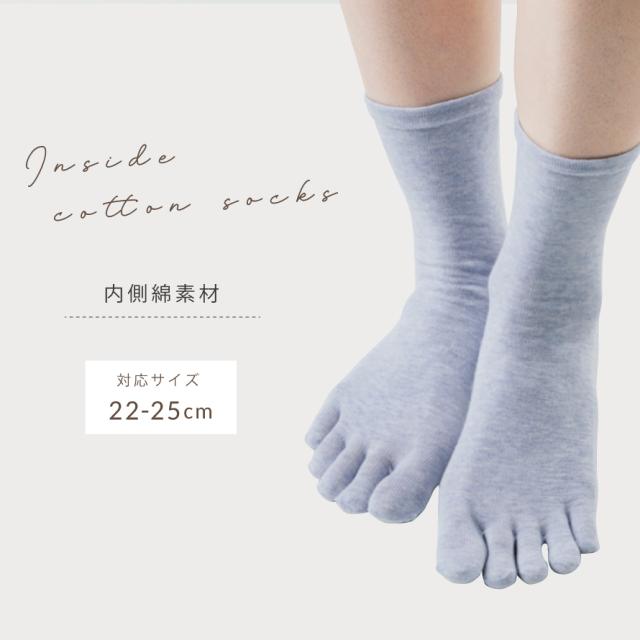 お肌に当たる内側に綿素材を使用した2層構造の5本指ソックスです。締め付けが苦手な方におすすめの口ゴムゆったりタイプ。
