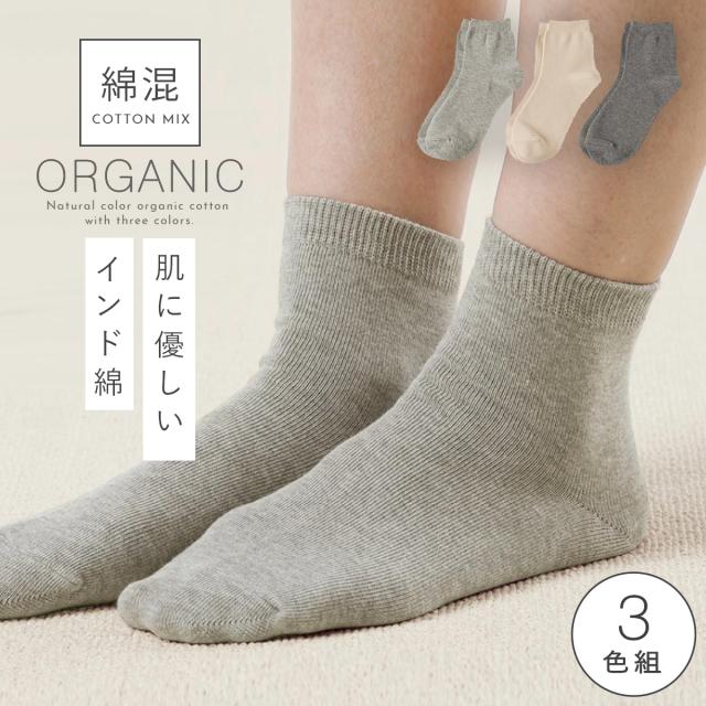 オーガニックコットン 靴下 履き口 ゆったり レディース 【3色組】22-25cm インド綿 口ゴムゆったり 【 口ゴムなし みたいな履き心地】 ゆるめ 締め付けない むくみ 介護 高齢者 シニア まとめ買い インド綿オーガニックコットンショート丈ソックス 跡がつかない