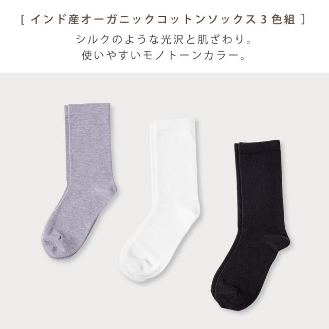インド産のオーガニックコットン使用。合わせやすいモノトーンカラーの3色組。