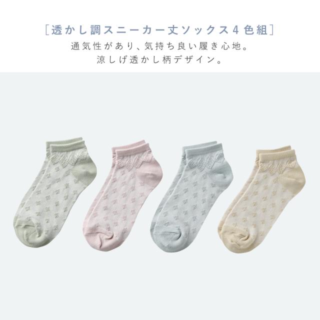 靴下 レディース 夏用,履き口 ゆったり ソックス,靴下,くつした,くつ下,ソックス,婦人靴下,4足組,セット,まとめ買い,薄手,薄い,春夏,春,夏,暑い,季節,涼しい,爽やか,さわやか,さらっとしている,さらさら,サラサラ,汗,べたつかない,吸水,ムレない,ムレにくい,薄手,薄い,薄め,履き口,ゆったり,口ゴム,ゆるめ,よく伸びる,足首,ゆるい,ゆるめ,足のむくみ,むくみ,伸びる,動きやすい,履きやすい,締め付けない,しめつけない,締めつけない,締め付け感なし,跡が残らない,跡がつかない,跡が残らない靴下,締め付けない靴下,ゴムのかたがつかない,きつくない,痛くない,足首,高齢者,シニア,お年寄り,介護用,つま先,かかと,補強,丈夫,スニーカー丈,くるぶし,くるぶしソックス,スニーカーソックス,ロークルーソックス,透かし柄,柄,パステルカラー,ピンク,グレー,ベージュ,グリーン,緑,上品,エレガント,洗い替え,22cm,22センチ,23cm,23センチ,24cm,24センチ,25cm,25センチ,22-25cm