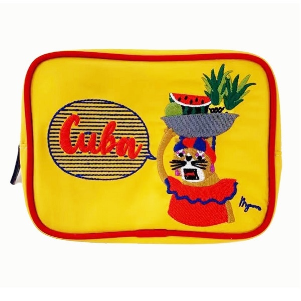 『MYUUA』キューバシリーズ。キューバの女性たちのドレスをイメージして、明るい配色のスクエアポーチにしました。メインの刺繍はフルーツかごを頭に乗せて運んでいるミューにゃ。かごの中には西瓜やパイナップルといったフルーツがもりだくさん。すべて総刺?で表現しています。外出時のお化粧直し用のメイクポーチとして、あるいはバッグの中で見失いがちな細々した小物を入れる用として、十分な容量があります。