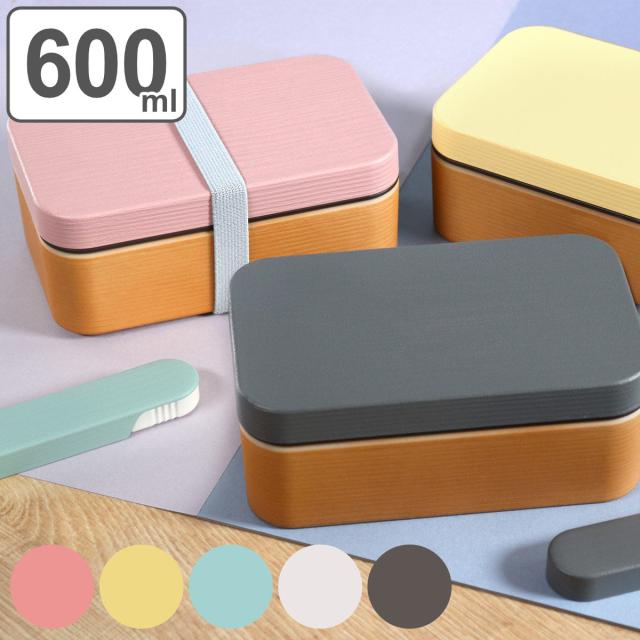 お米がくっつきにくい角型1段のお弁当箱です。蓋はペールカラーの5色展開です。木目と淡い色の蓋の組み合わせが優しい印象で、木目調に仕上がった表面は凸凹していて木のぬくもりを感じる手触りです。容量は600mlで小学生のお子様から大人の方まで幅広くお使いただける使いやすいサイズです。