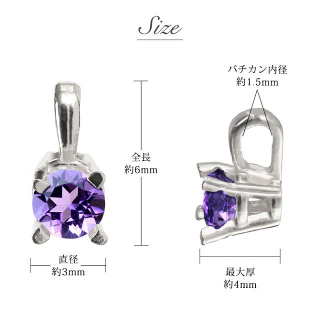 寸法:全長6mm 幅3mm 最大厚4mm バチカン内径1.5mm誕生石の直径:約3mm
